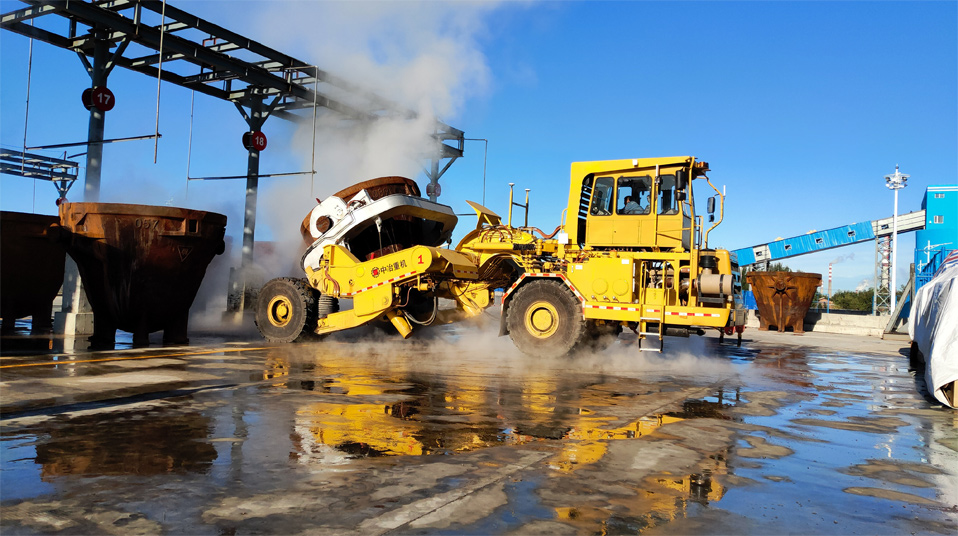 由中冶寶鋼研制的70噸鉸接式抱罐車,采用鵝頸鉸接型式,額定載重75噸,重載最高時速為每小時20公里,翻罐角度105度,最大爬坡能力8%,最小轉彎半徑9米。該車型應用專利技術10項,在國內有色冶煉市場占有率超過75%,先后榮獲中國有色工業協會、中國鋼鐵工業協會科技獎,中國施工企業管理和中國循環經濟協會專利獎等榮譽。